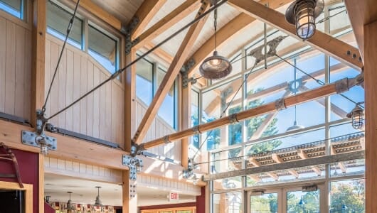 We often design bents from 24′ up to 48’+, but they can span up to 80′ or so, provided there are sufficient columns and logical load paths. As with all timber construction, spans and member sizes vary greatly with the species of timber, local loading requirements, bent spacing, and type of joinery involved.