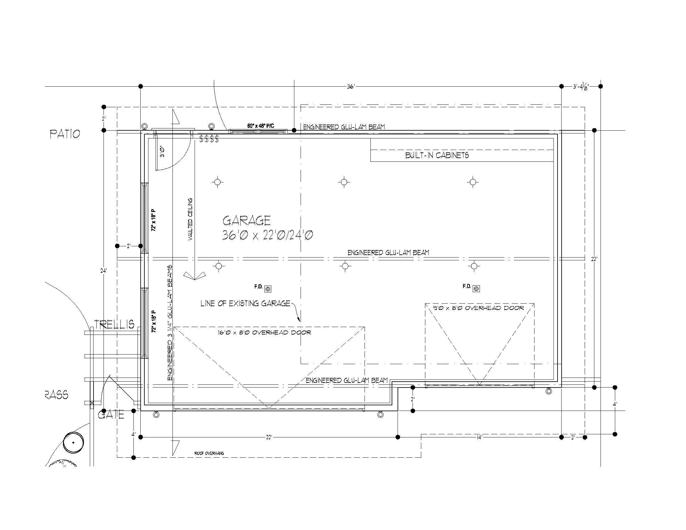 Unfortunately I only received a single attachment – a plan view of the garage showing the 24’x36′ plan and highlighting three glulam beams.
