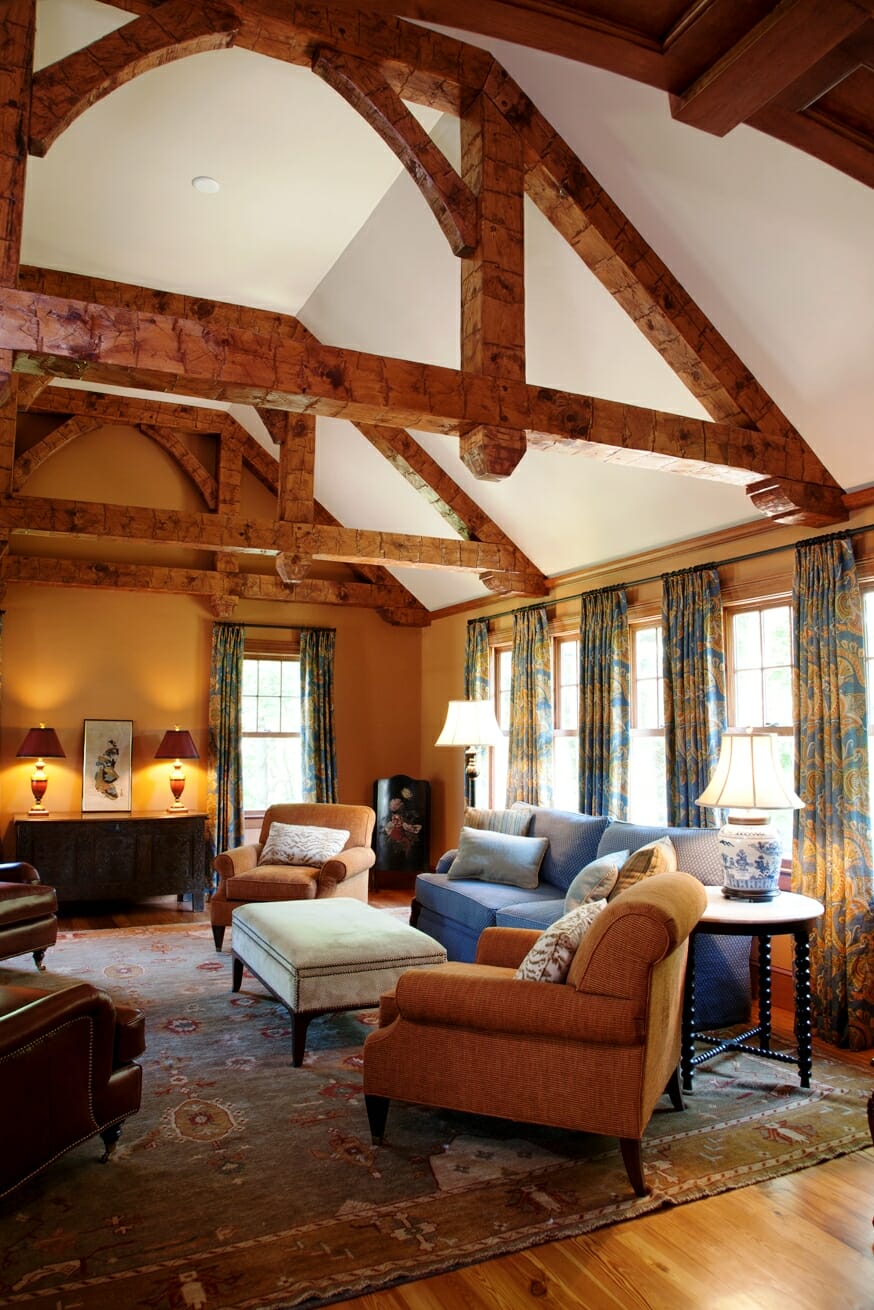 Sometimes textiles can make or break the feel of a space. A perfectly coordinated rug or curtains can give a room a specific style. Often times, people think that you can only decorate a timber frame home rustically, but that is not always the case. With textiles, you can change the style of the home from rustic to elegant, country-cozy to Southwestern, or vintage-romantic to modern-contemporary. The timber frame home can be decorated to fit any taste or style.