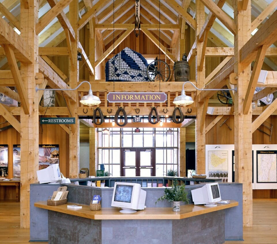 The Southern Vermont Welcome Center is just past the Massachusetts border on Interstate 91 North. Vermont Timber Works built a custom timber frame with an old Vermont style barn for the welcome center.