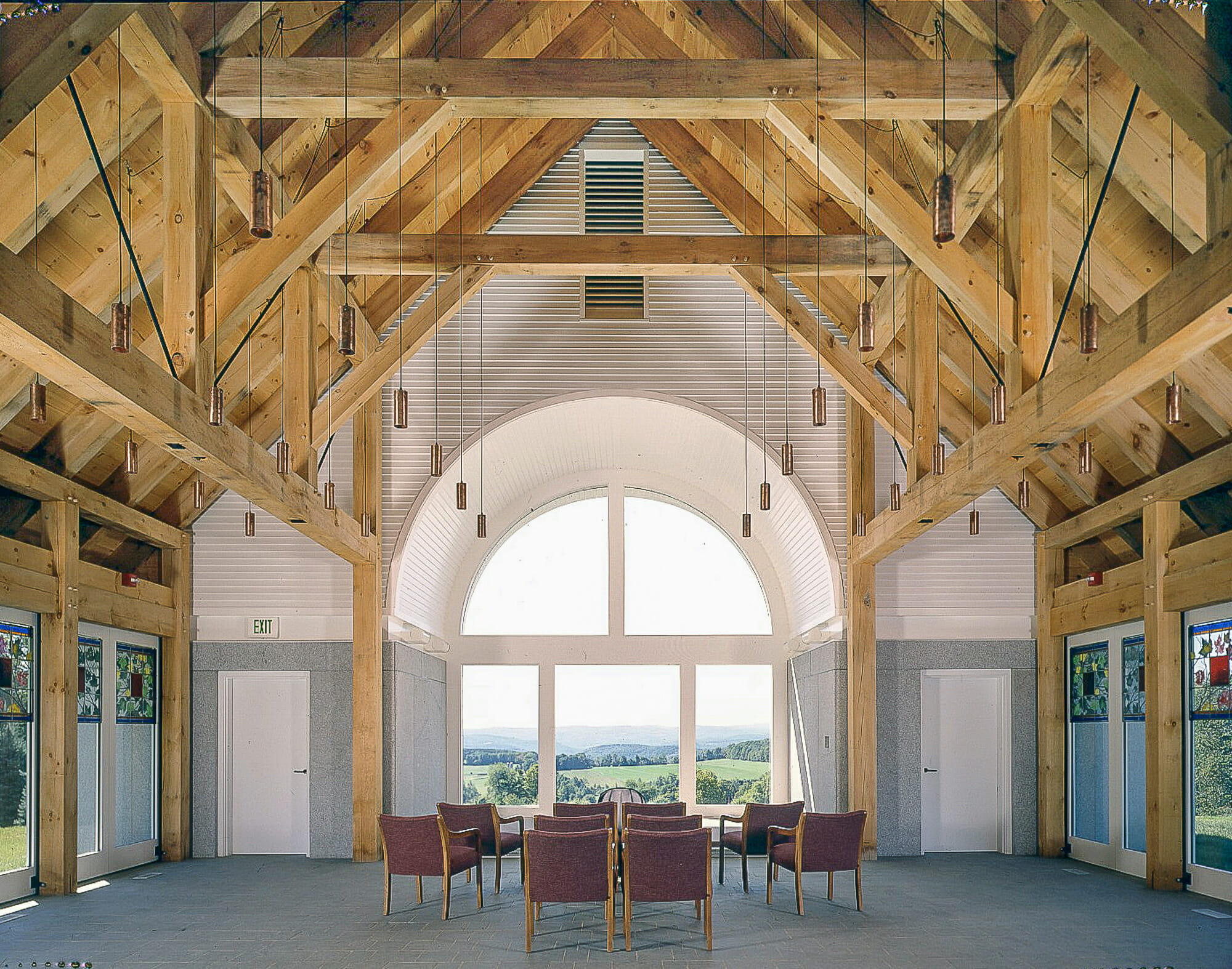 The frame features long central girder trusses that are reinforced with steel rods. The girder trusses are acting as principal purlins. We worked with architect Marcel Beaudin, AIA, engineers Dufresne-Henry, Professional Construction Inc., and the State of Vermont on this lovely chapel.