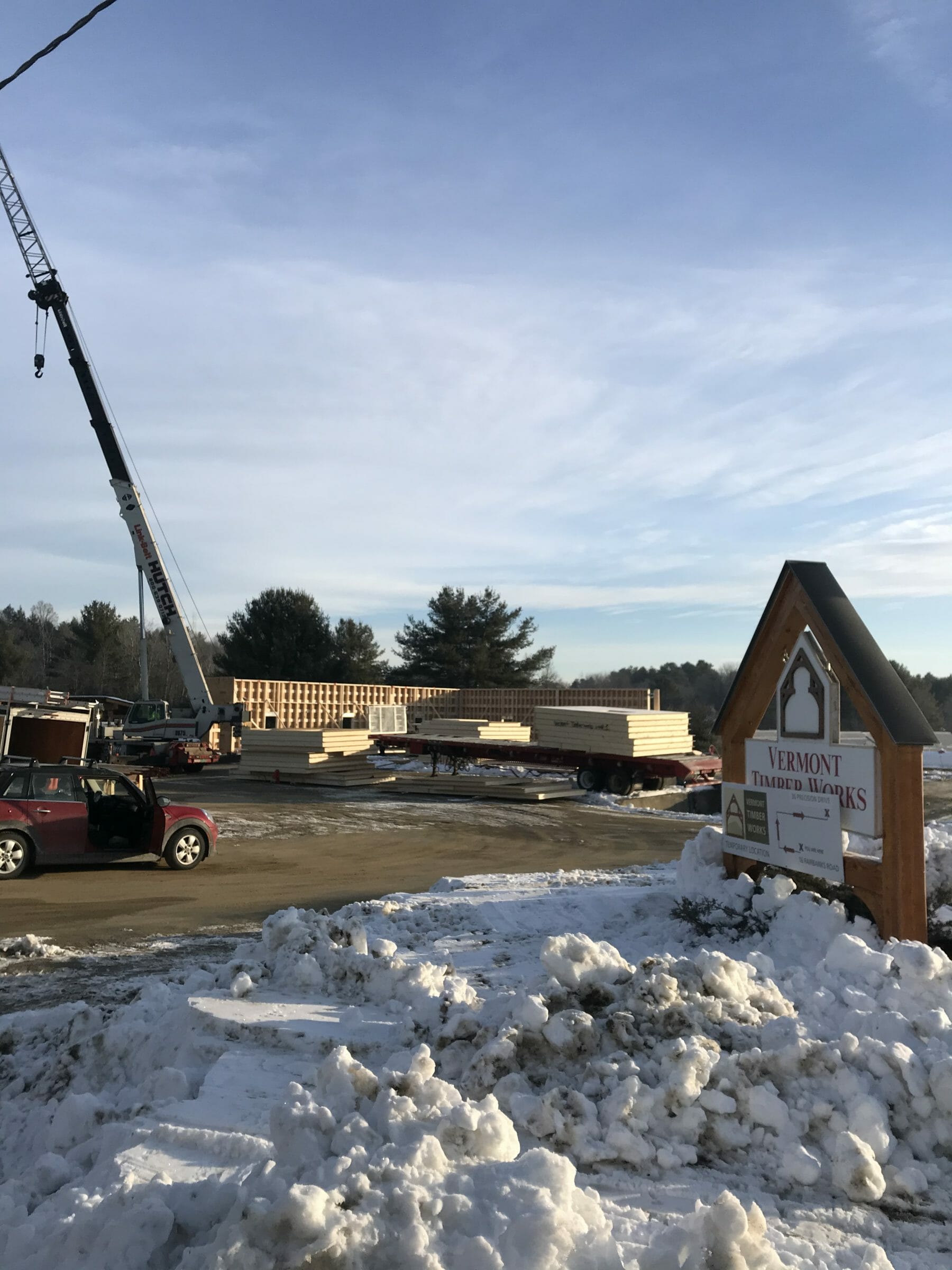 A crane lifting pieces into place at the rebuilt Vermont Timber Works