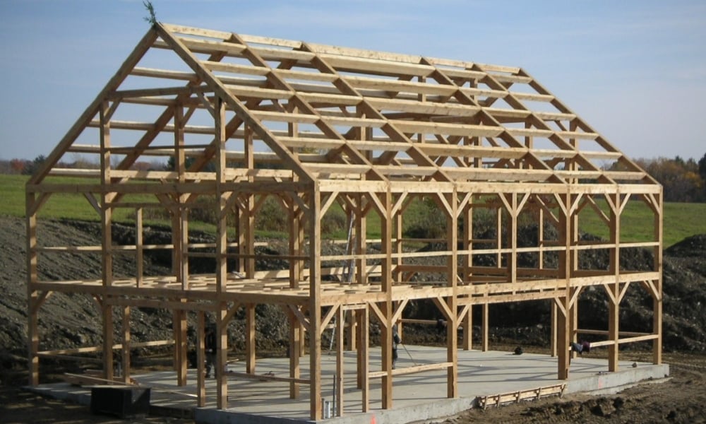 There is also a difference between a custom timber frame and a “kit” timber frame.  Kits are pre-manufactured buildings, cookie cutter type houses/barns/sheds, that come with all the trimmings and provide a finished product.  A custom timber frame from Vermont Timber Works is exactly what it says…a custom timber FRAME.  The finishing touches are up to you.  We provide the skeleton for the building.  Any 2x, overbuild, or conventional framing materials would be purchased separately through a local lumber supplier or through a general contractor.