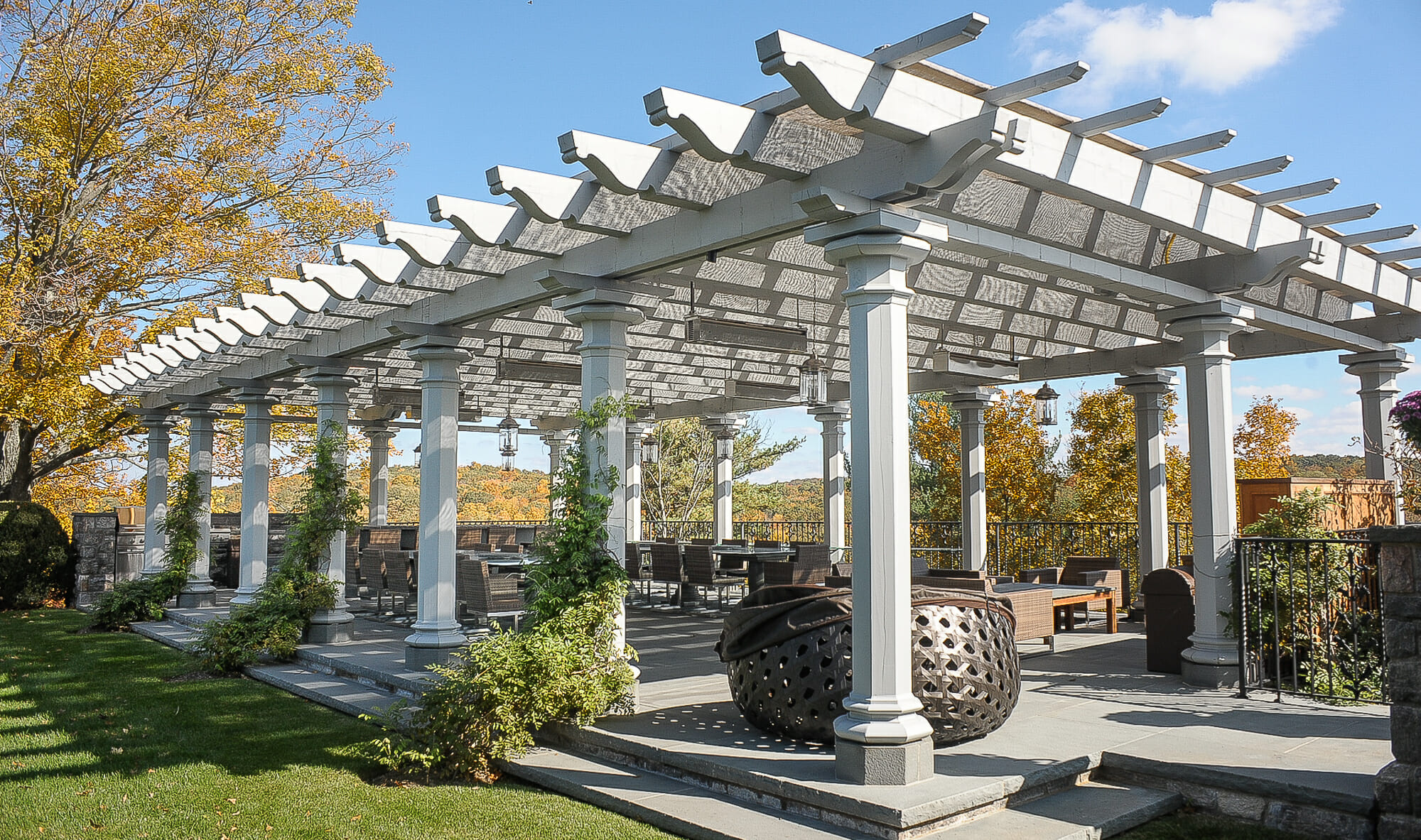 The photo on this page features the High Winds Pergola. A beautiful white oak timber framed pergola with custom scroll work on the rafter tails.
