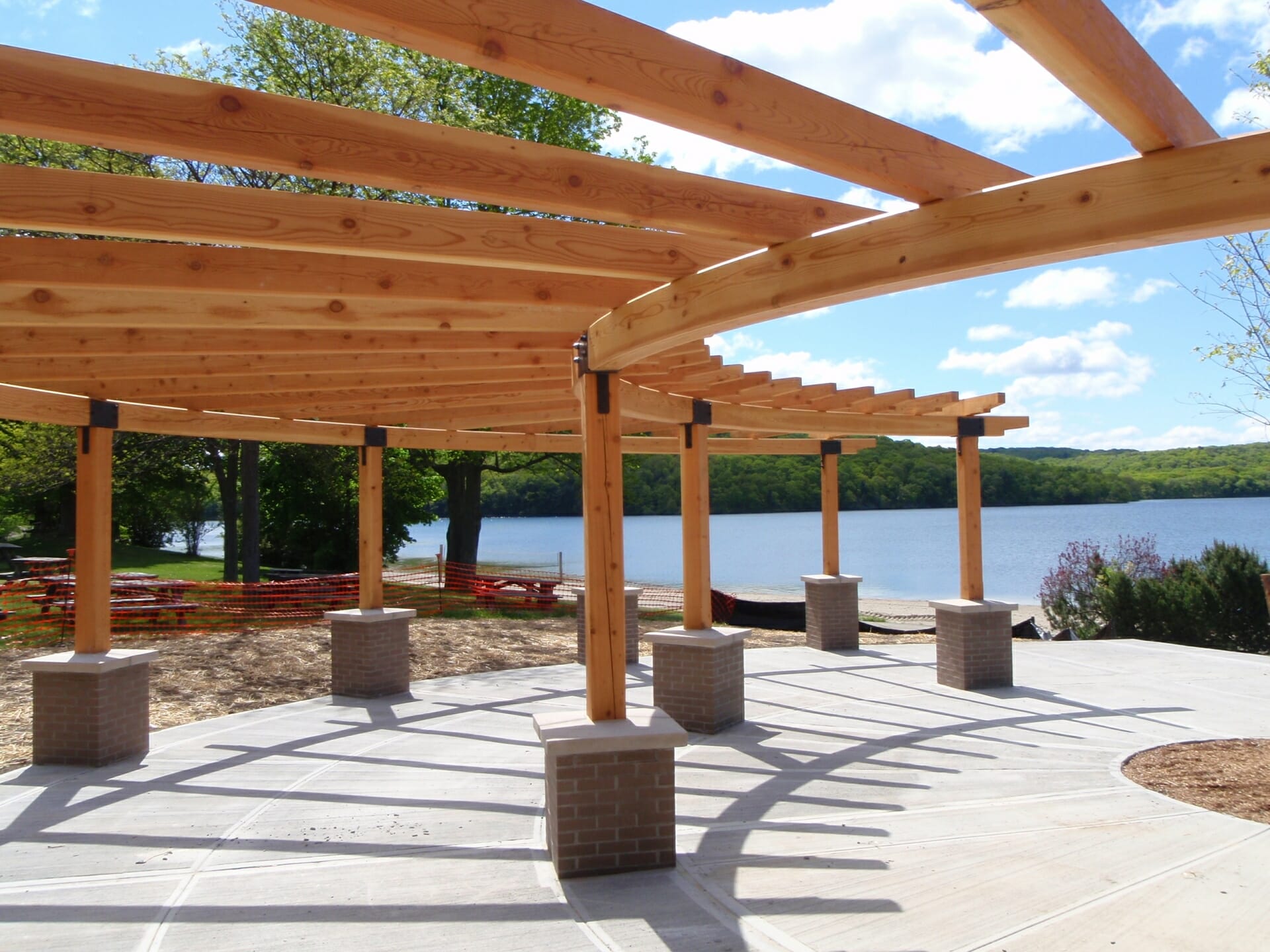 A photograph of the perimeter posts, beams and glulam wood arches going up. Notice the size of the man on the staging to get a feel of the scale of the frame. The 12×16 posts are about 40′ tall and the arches are 25′ long.