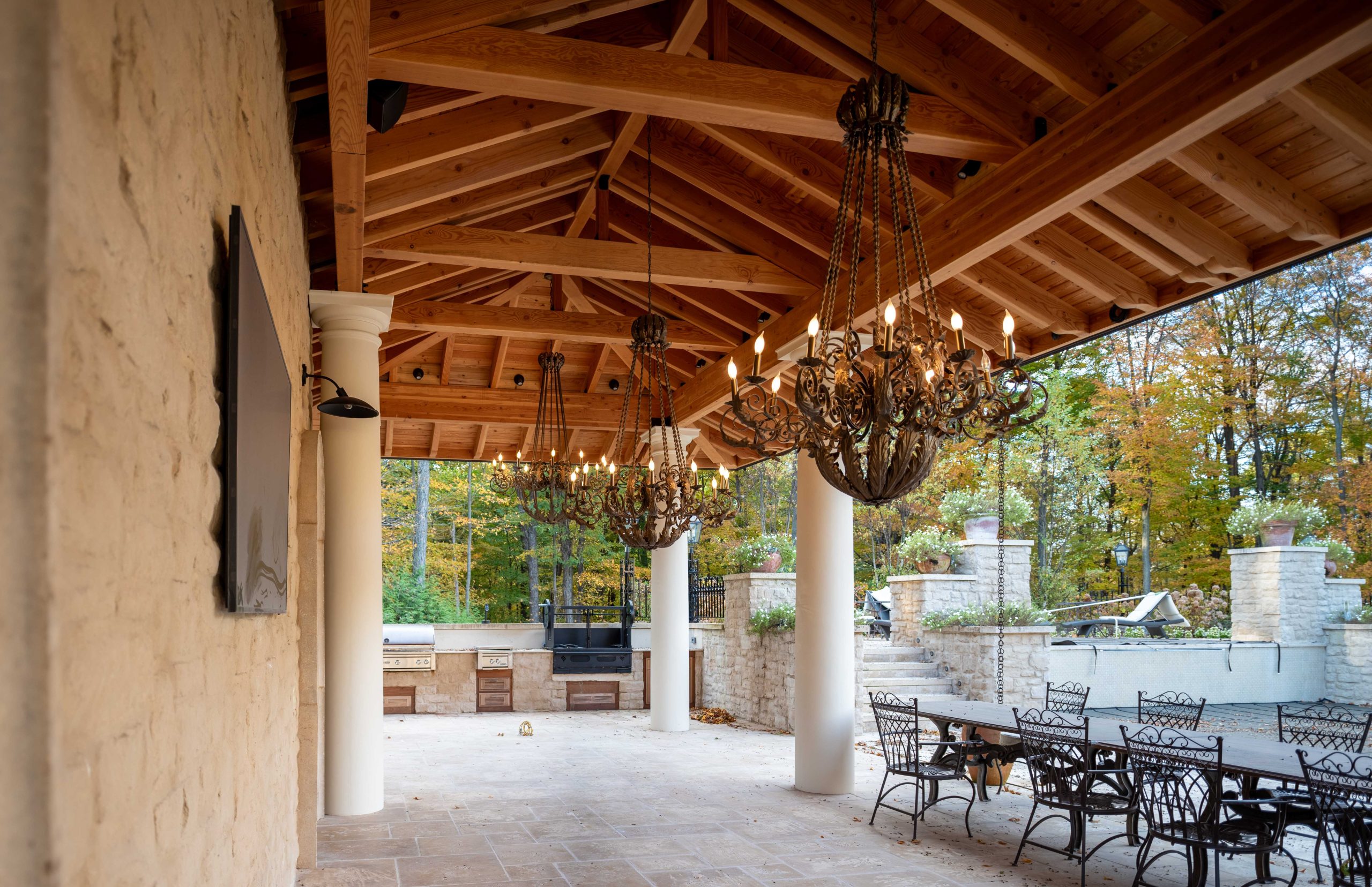 The Mediterranean-style pool pavilion is located in Monroe County, NY. It features a wooden beam ceiling, large white columns, beautiful stone arched doorways, iron lamp posts and chandeliers, and an Italian-style barrel clay tile roof. It is interesting because a classic timber frame roof system is set on top of roman columns. The timber rafters have decorative scrolled ends.