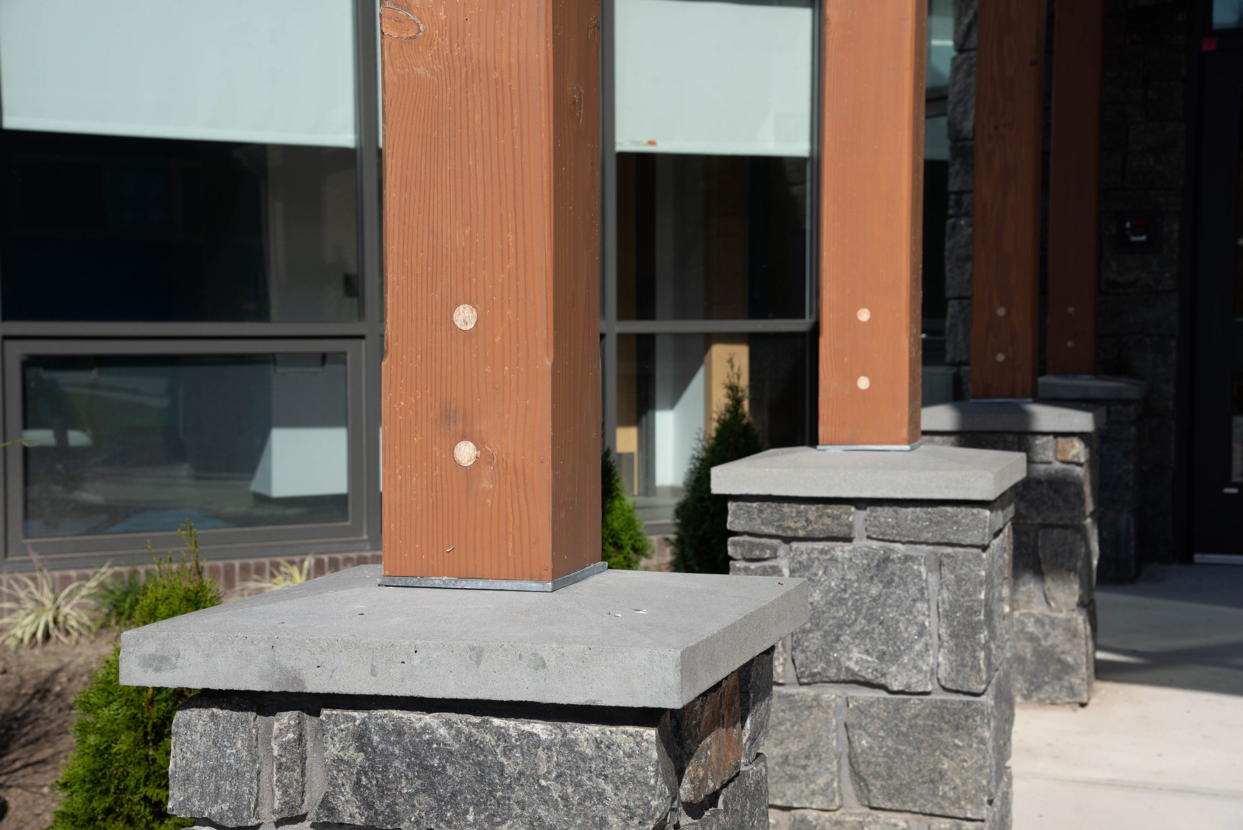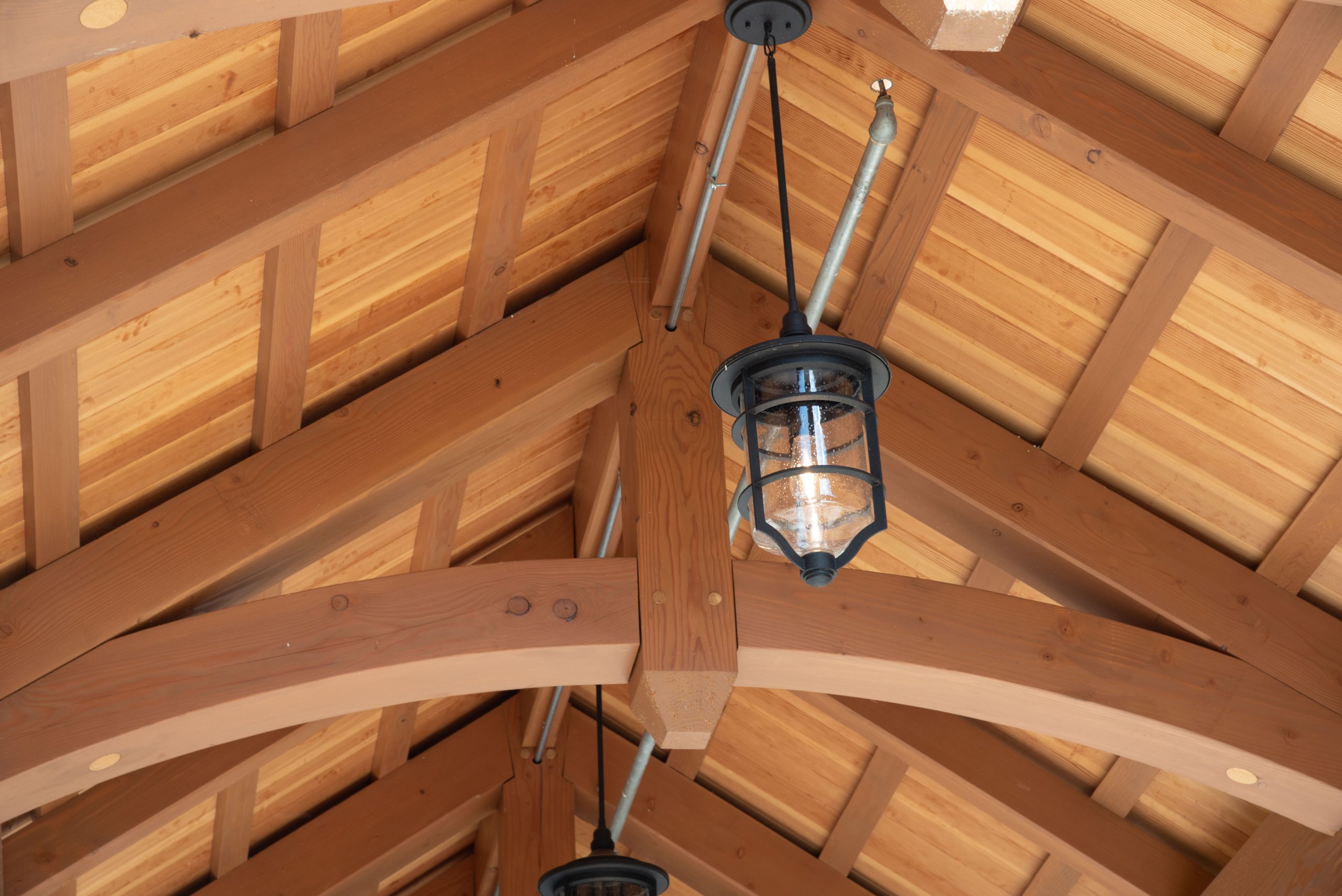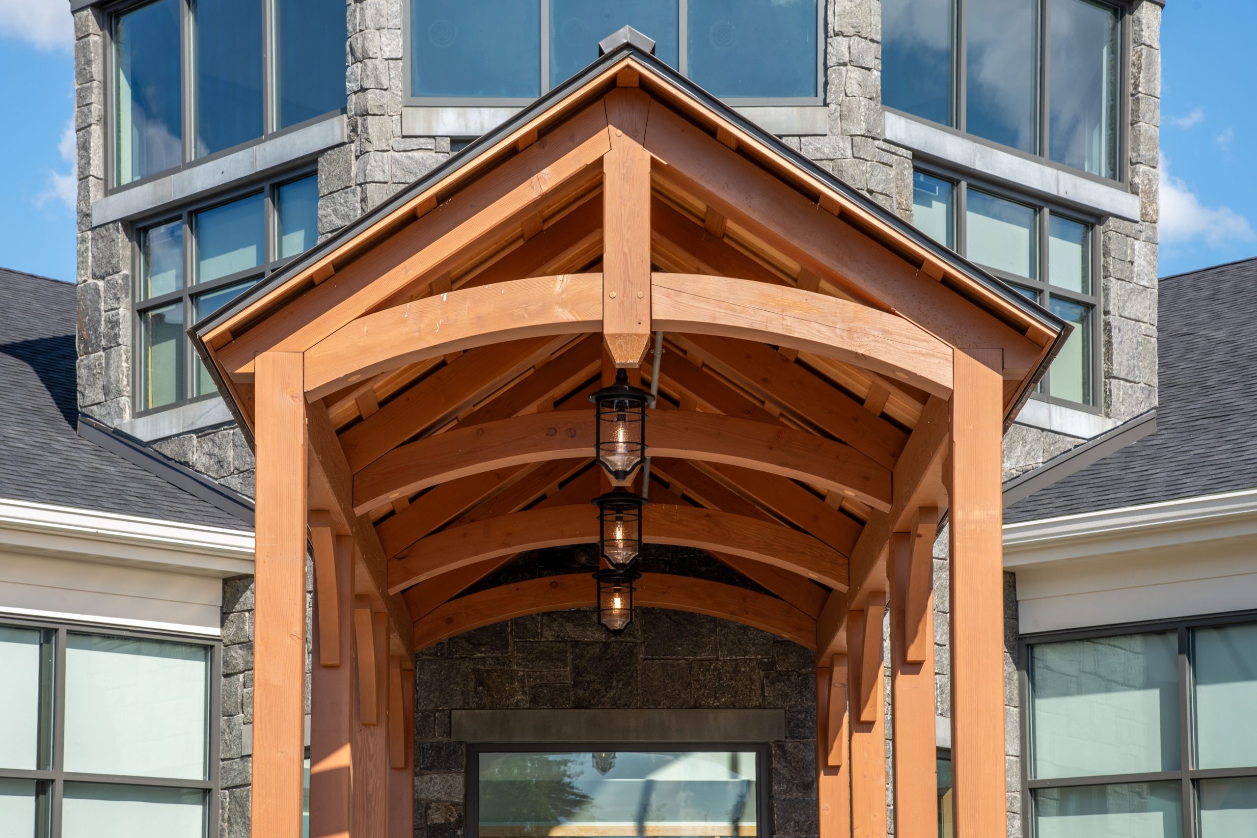 The RFK School entrance in Massachusetts is fabricated from rough sawn Port Orford Cedar and finished with a light stain. The trusses feature a curved bottom chord and the post bases are finished with stone veneer. This entrance was designed by Peterman Architects.