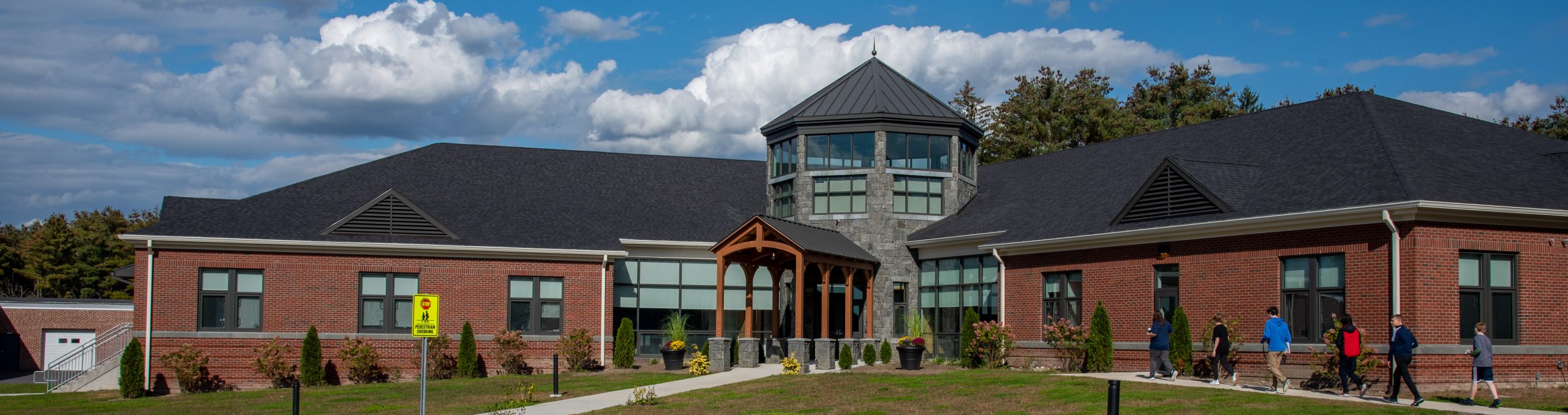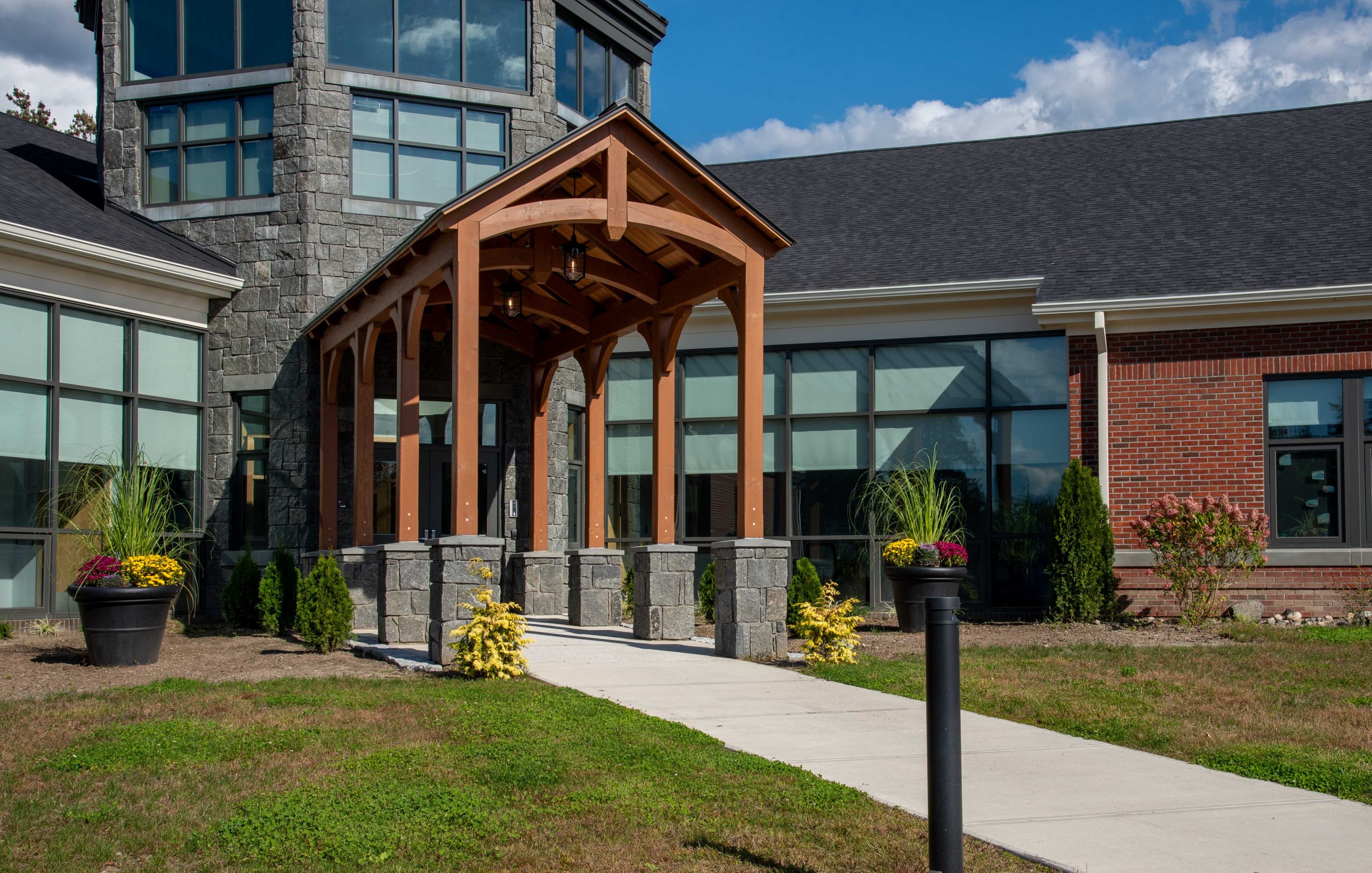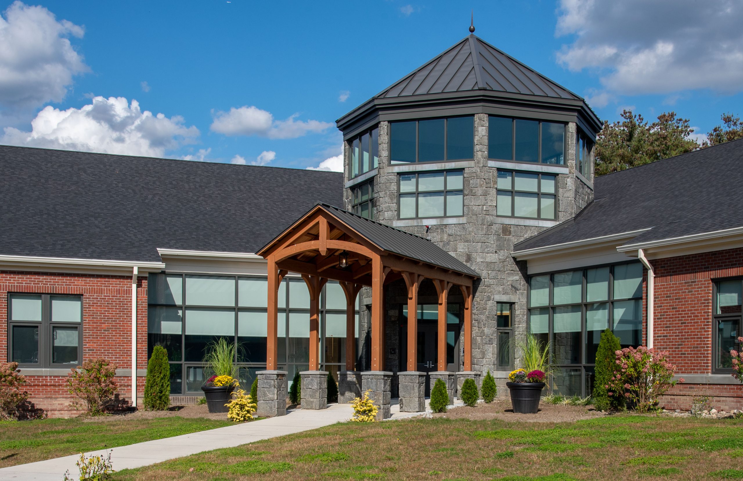 The RFK School entrance in Massachusetts is fabricated from rough sawn Port Orford Cedar and finished with a light stain. The trusses feature a curved bottom chord and the post bases are finished with stone veneer. This entrance was designed by Peterman Architects.