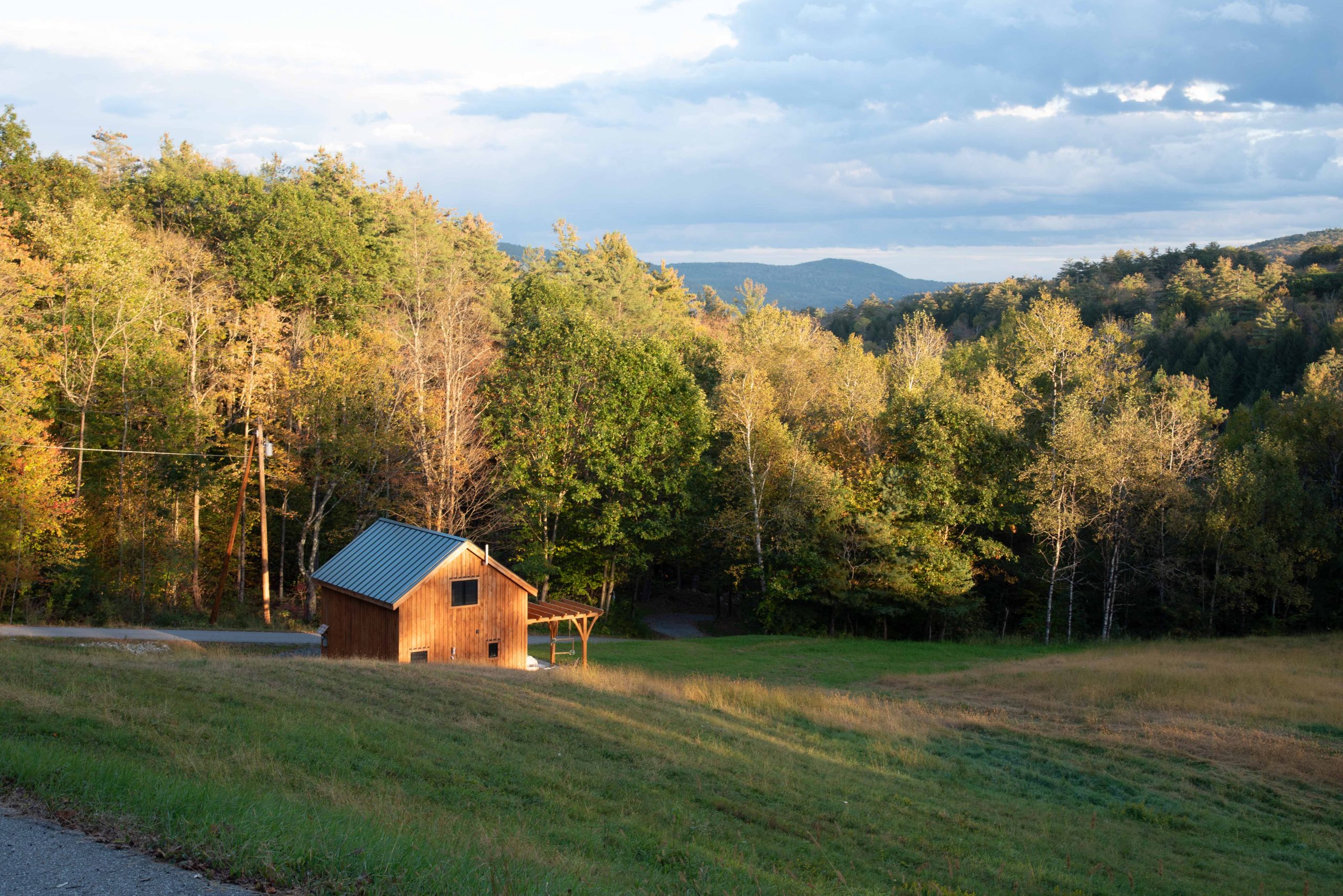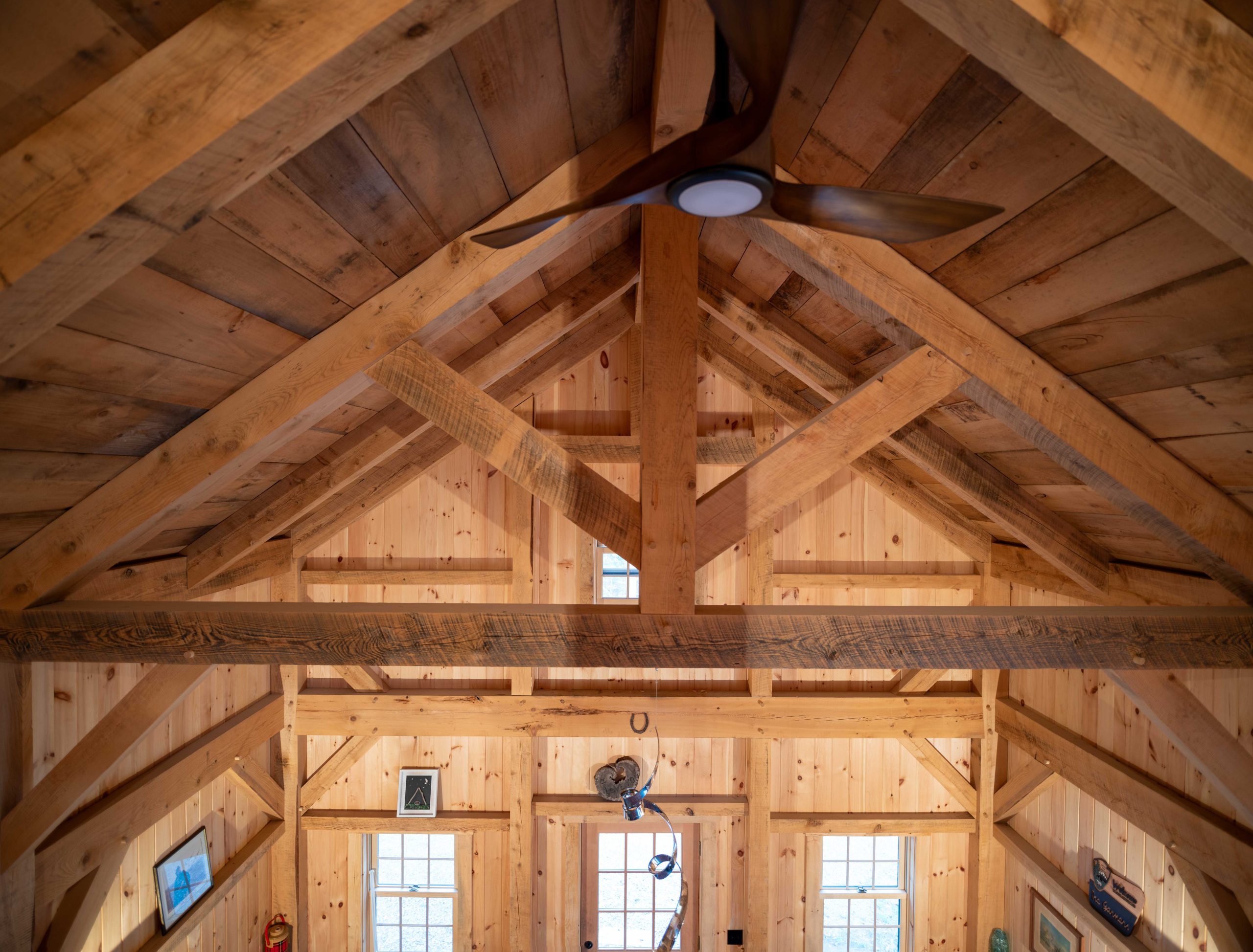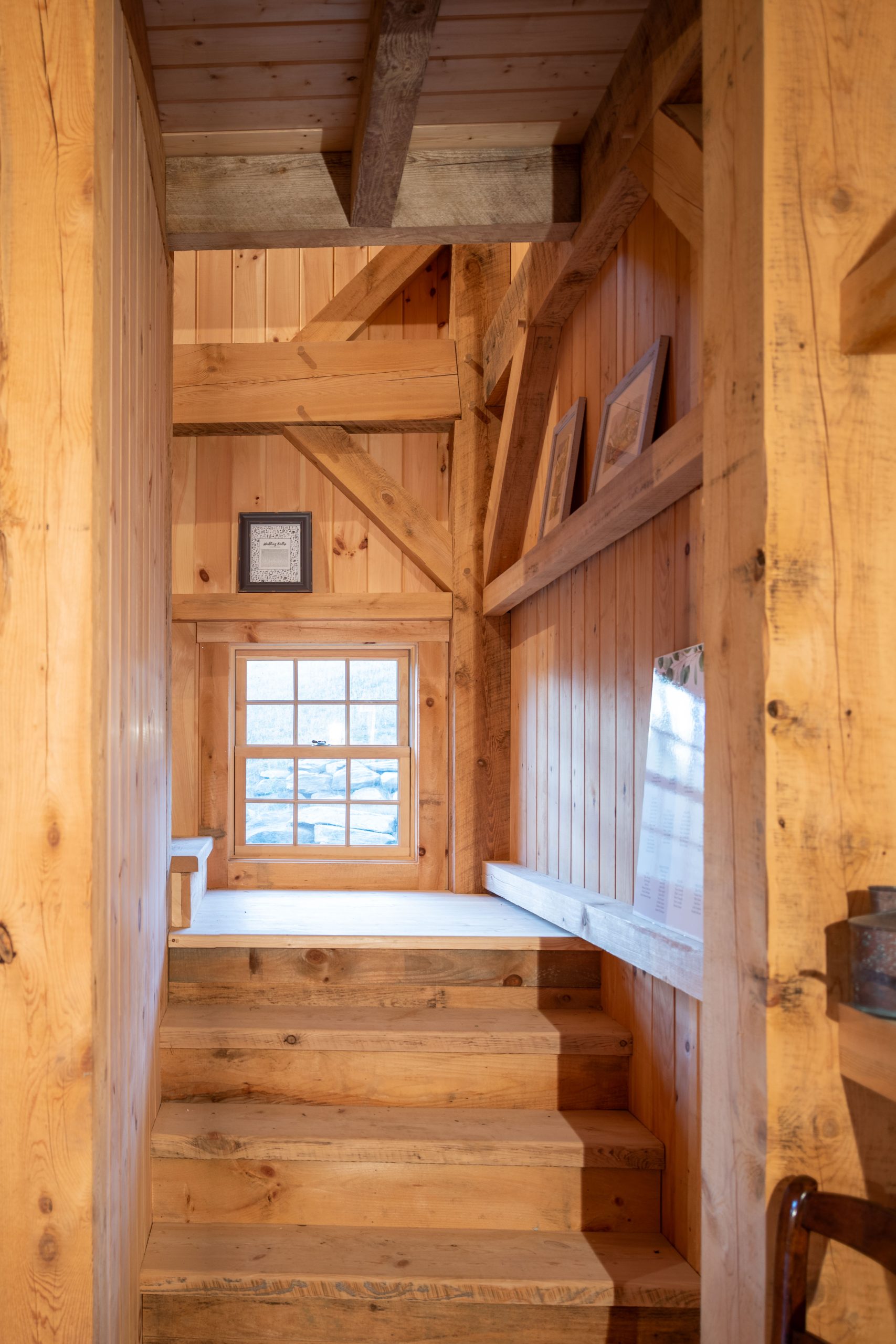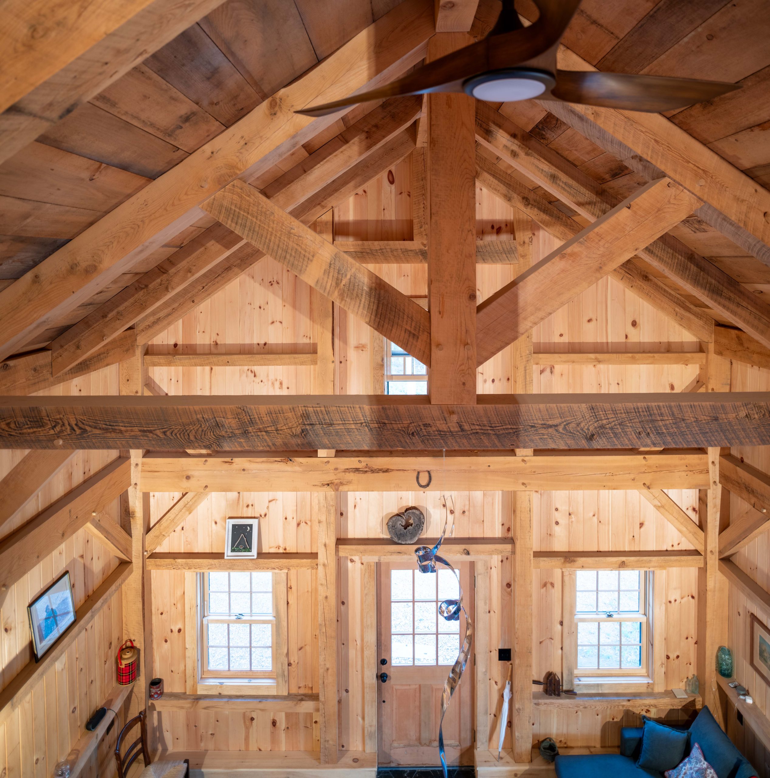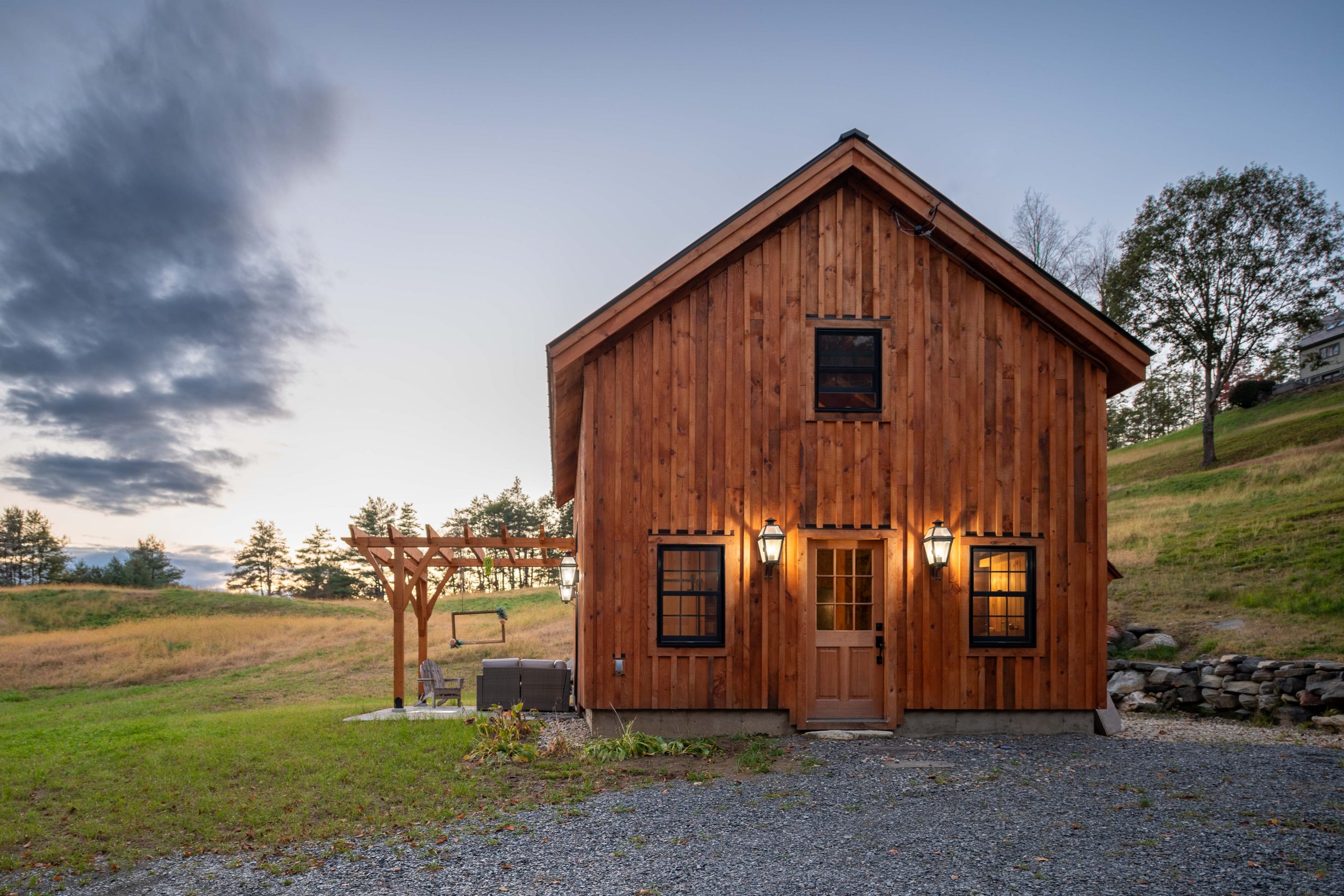 The Vermont Guest Barn features a simple, yet classic barn style and a small pergola over the patio area. It was made with rough sawn Hemlock harvested from the client’s land.